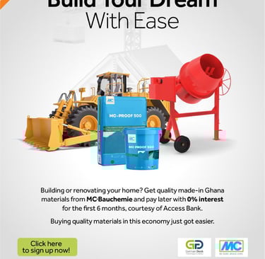 At MC-Bauchemie Ghana, we believe that quality construction materials should be within reach. With our Pick & Pay Later financing in partnership with Access Bank, you can get the materials you need today and pay in installments.